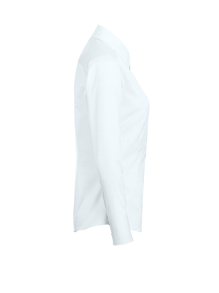 Klassische langärmelige Bluse mit Kent-Kragen, leichter Taillierung durch Wiener Naht im Vorderteil und Abnäher im Rückenteil, leicht gerundetem Saum, modischer Paspel aus dunkelblauem Satin an der inneren Kragennaht, hochwertig und schmal verarbeiteter Knopfleiste, doppelter Schulterpasse, 4-Loch-Knöpfen - über Kreuz vernäht und doppelt verknotet für extrafesten Halt -, Ersatzknöpfen und Seitenschlitzen. Hergestellt aus formstabilem, strapazierfähigem und bügelfreiem Baumwoll-Popeline. Gewebtes HAKRO-Necklabel aus hochwertigem Kettsatin mit weichen, ultraschallgeschnittenen Bandkanten für höchsten Tragekomfort. • Material: Gewebe aus 100 % Baumwolle • Gewicht: 120 g/m2 • Ausrüstung: einlaufvorbehandelt, bügelfrei • Passform: Regular Fit • Zertifikate: OEKO-TEX® STANDARD 100 • Waschtemperatur: max. 40 °C • Größen: XXS-3XL